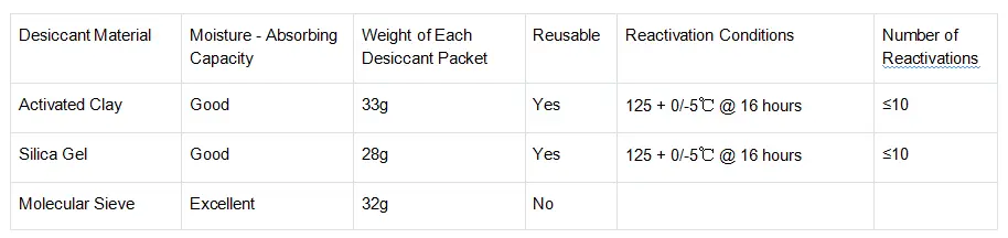 Each desiccant packet must have a minimum moisture absorption capacity of 2.85g at 20% RH @ 25°C. Commonly used desiccant packets are shown in Table 6: